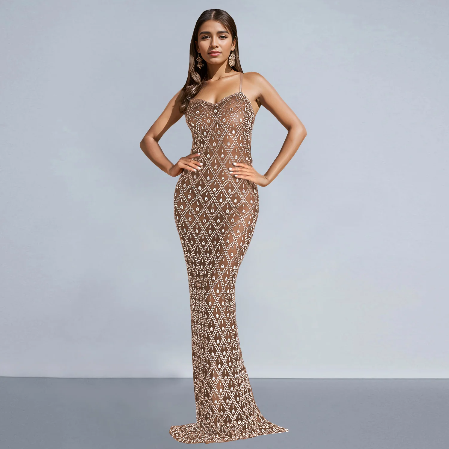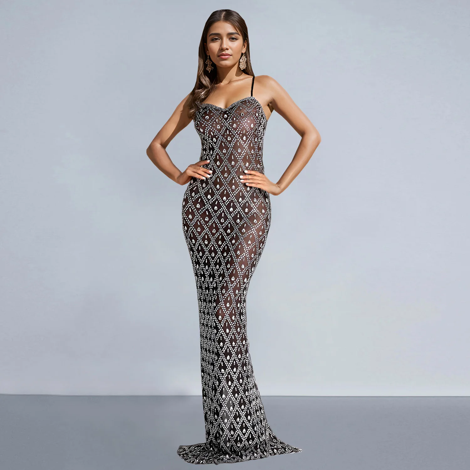 Mesh Diamond Hotfix See Through Sexy Maxi Dress for Women Gown Fashion Elegant Sleeveless Backless Club Party Evening Dress